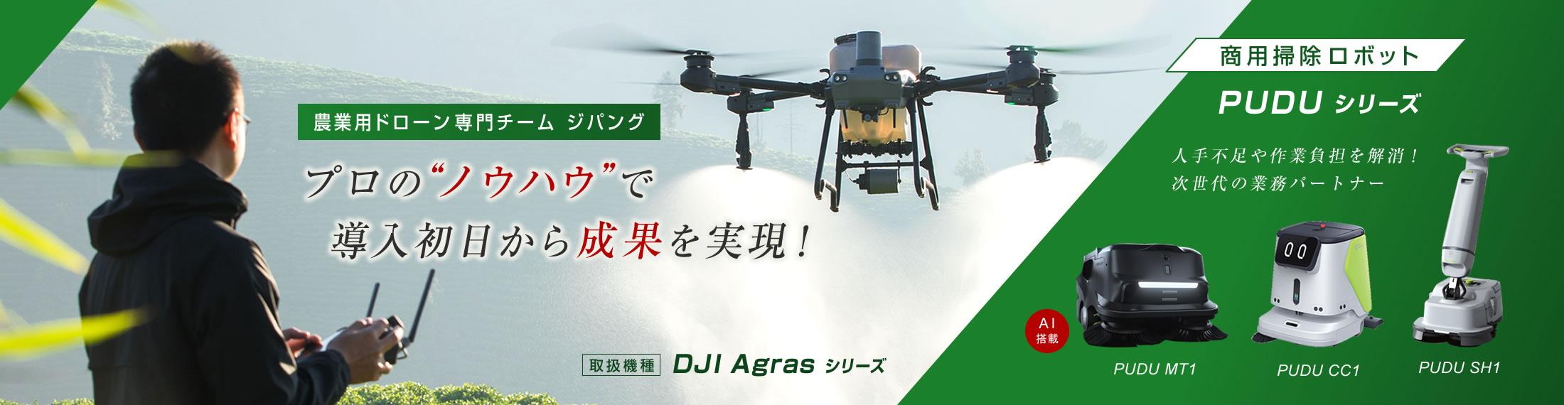 ジパングでは、農業用ドローン本体はもちろん、運用に欠かせないバッテリー・充電器などの周辺機器、さらに今後は清掃ロボットや芝刈り機などの関連ロボティクスまで幅広く取り扱っています。