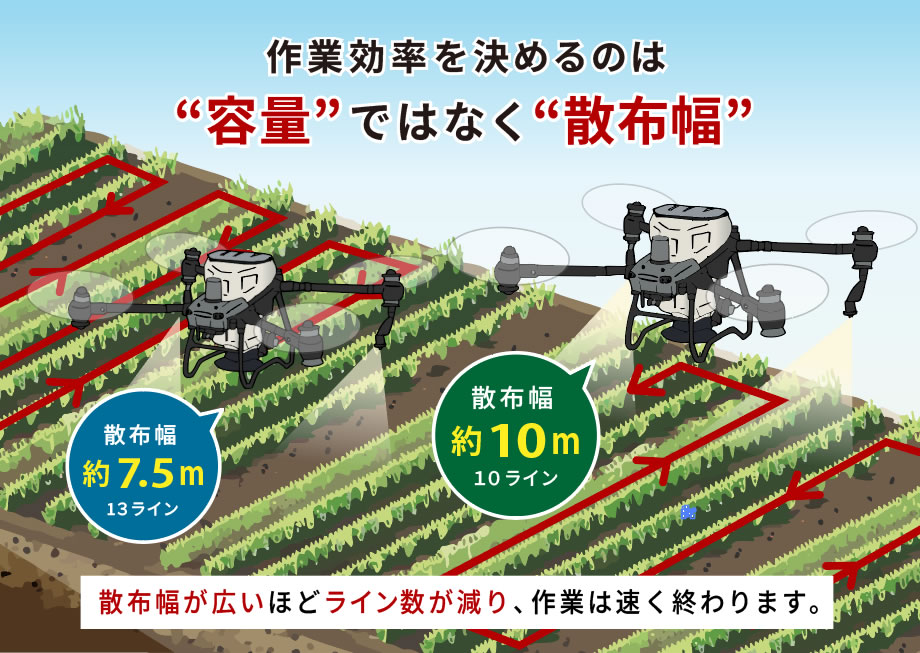 農業用ドローンの作業効率は、積載容量の大きさではなく、どれだけ広い幅で一度に散布できるかによって決まります。