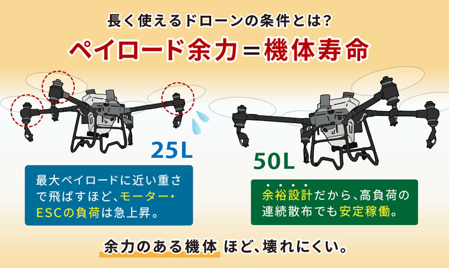 積載量に対して機体にどれだけ余力があるかは、耐久性に大きく関係します。