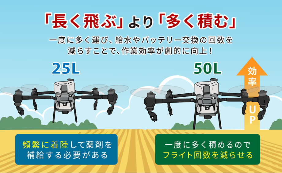 - 容量が大きいと「薬剤を多く積める」ため、離着陸・補充回数を減らせる