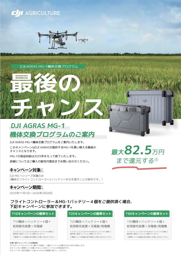最後のチャンス DJI AGRAS MG-1 の機体交換プログラムをご案内します。MG-1 の部品供給は 2025 年で終了します。 対象の方は本プログラムを利用して新しい機体への切り替えをご検討ください。 本プログラムでは、フライトコントローラーと MG-1 バッテリー 4 個をご提供いただくことで、最大 82.5 万円まで還元します。 対象 DJI MG-1 シリーズをご使用中の方。 期間 2025年11月1日 から 2026年2月28日 まで。 交換候補の機体 T10、T25、T50 の標準セットを ...